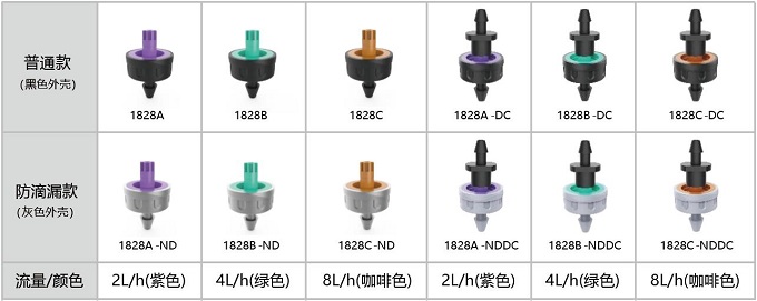 1828壓力補償式滴頭防滴漏款,具備在較低系統壓力下,“隨時待命”的新功能。特有的“防滴漏”功能,在系統停止灌溉、管道壓力為10~30KPa時,保證滴頭停止出水,且管道內仍充滿水,系統再次啟動時,滴頭可快速同時開始工作。